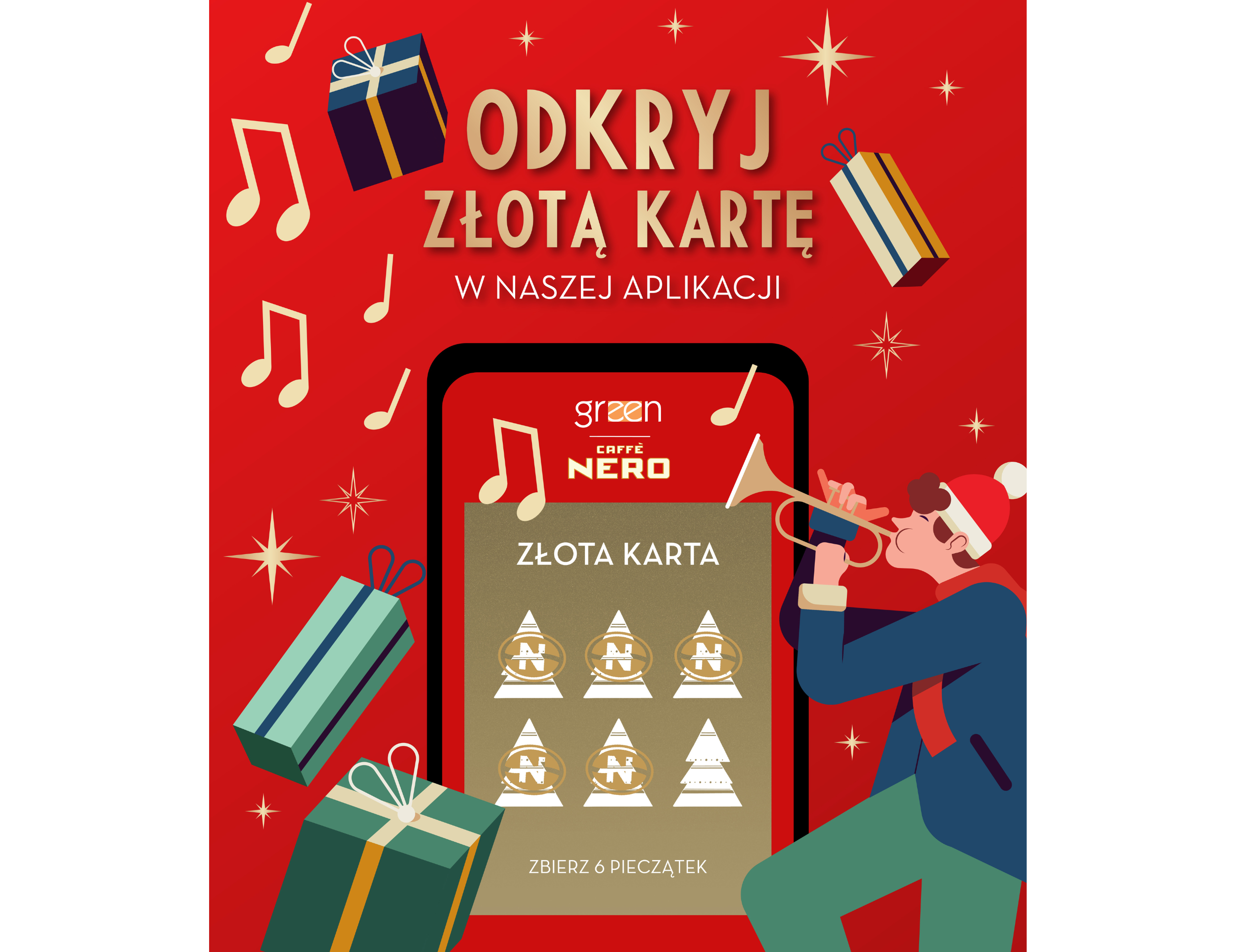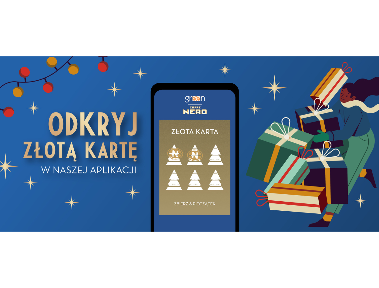 Świąteczny czas w Green Caffè Nero to chwile spokoju, korzennego aromatu i smakowitych przyjemności, a teraz to także nagrody dla naszych stałych gości. W aplikacji Green Caffè Nero czeka na Ciebie Złota Karta, dzięki której każda świąteczna wizyta może zakończyć się miłym upominkiem.