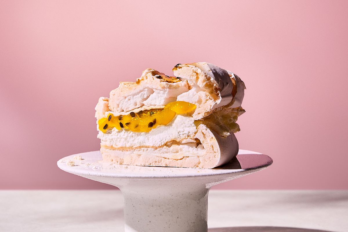Nasza kultowa beza w tropikalnej odsłonie, ze słodkim kremem mascarpone i wyrazistą marakują.