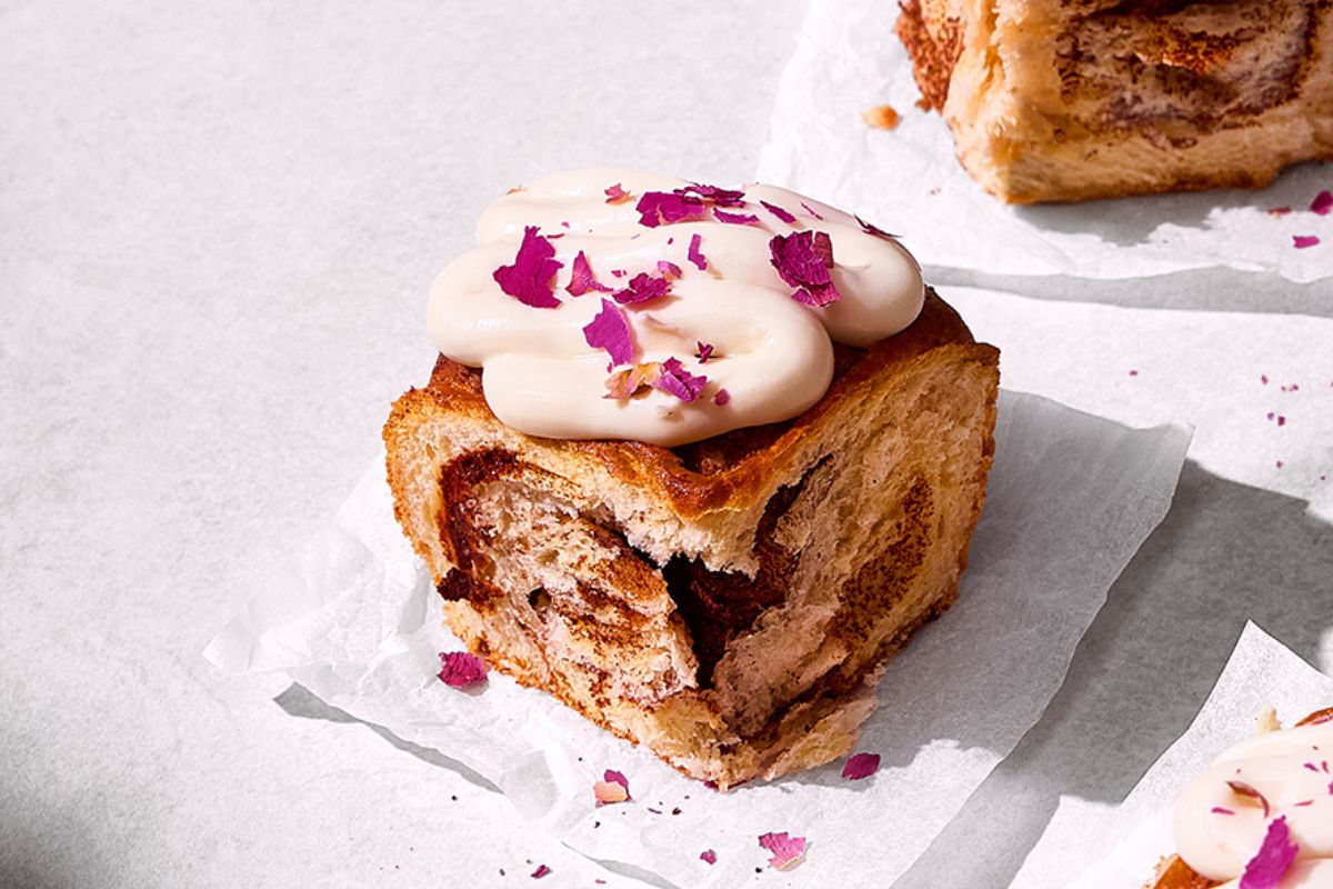 Miękka i aromatyczna cynamonka z polewą o smaku białej czekolady, posypana delikatnymi płatkami piwonii.