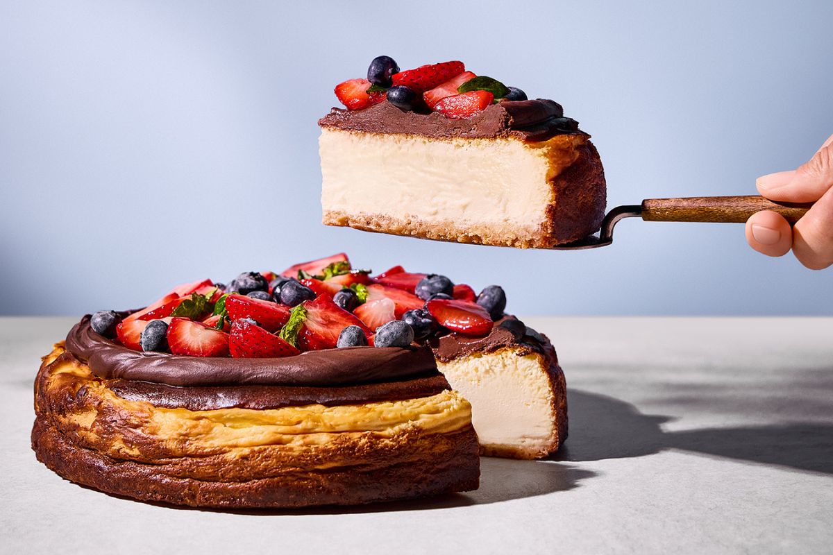Kremowy sernik baskijski o głębokim smaku i delikatnej, rozpływającej się konsystencji, z ganaszem z ciemnej czekolady i świeżymi owocami.