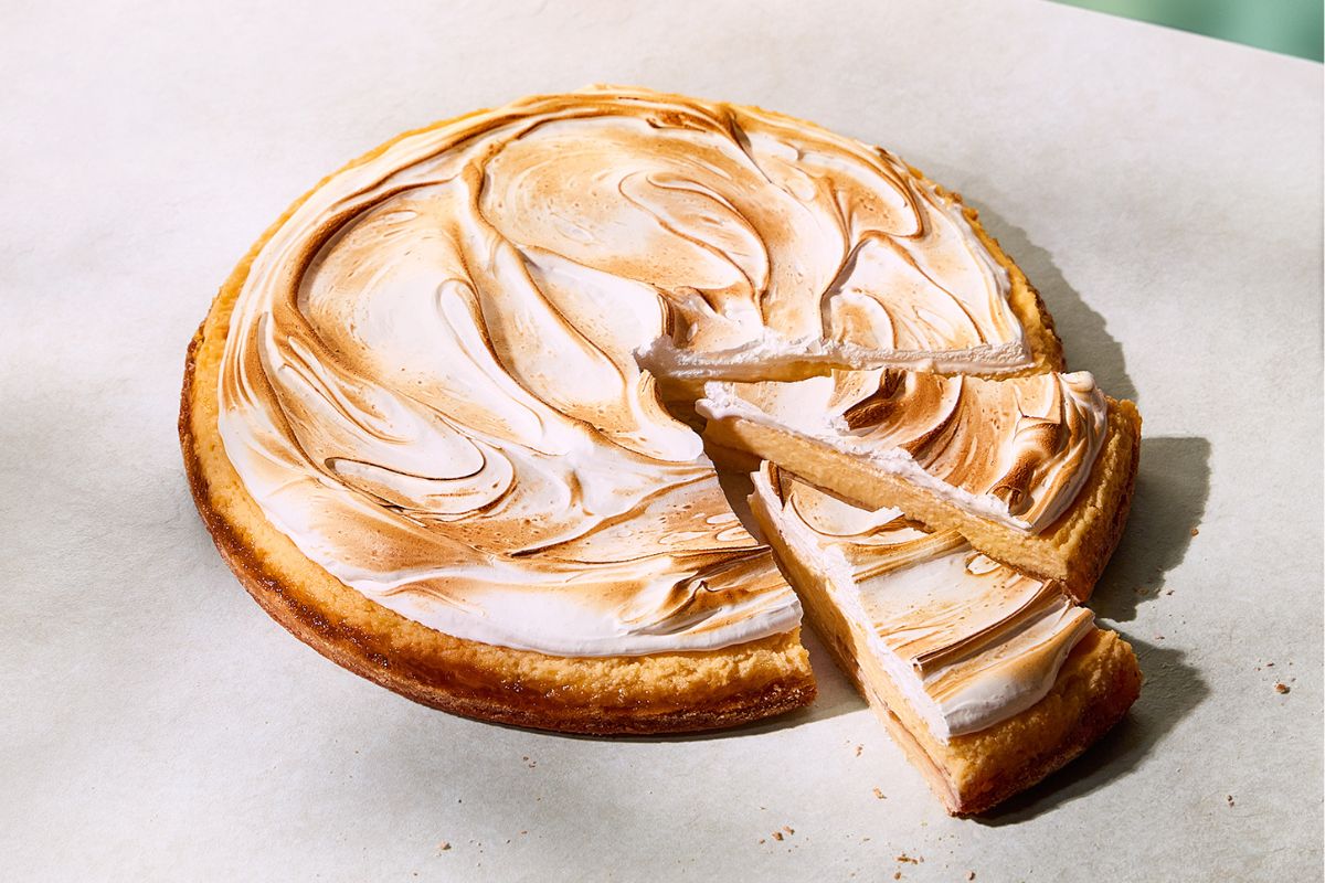 Krucha tarta wypełniona intensywnie cytrynowym kremem, wykończona delikatnie opalaną, chrupiącą włoską bezą.