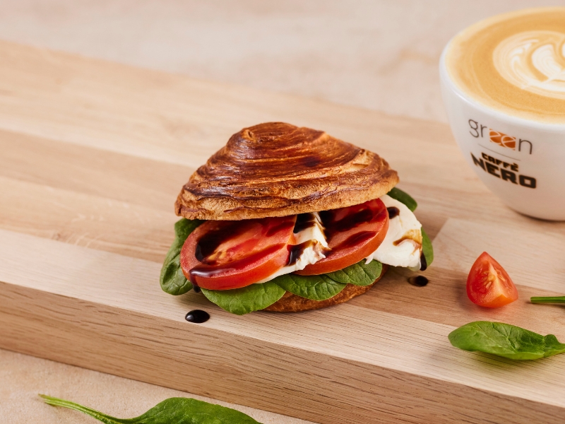 Świeżo wypiekana bułeczka z ciasta francuskiego z dodatkiem mozzarelli, pomidora i sosu balsamicznego.