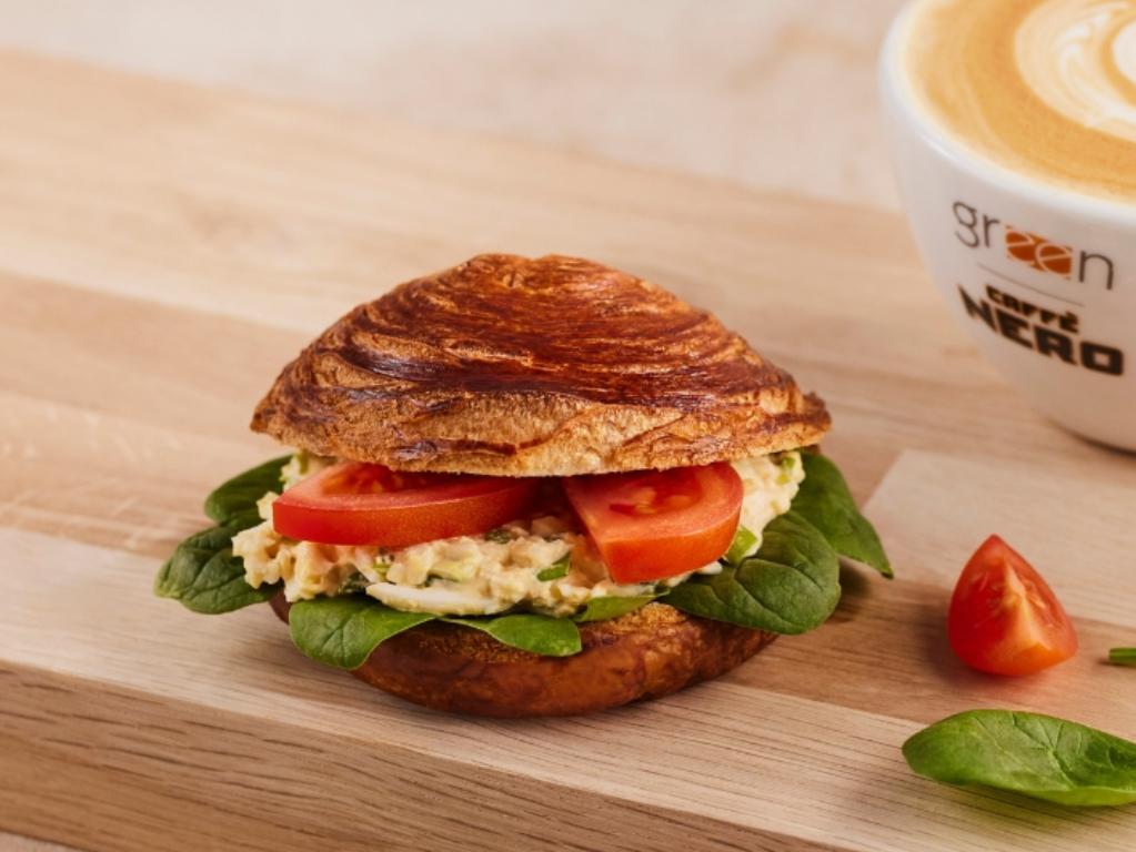 Świeżo wypiekana bułeczka z ciasta francuskiego z dodatkiem pasty jajecznej, pomidora oraz szpinaku.