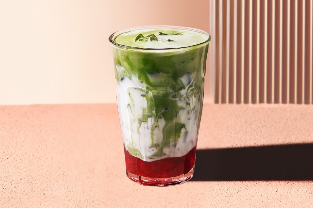 Kremowa matcha na lodzie z truskawkową nutą i mlekiem.